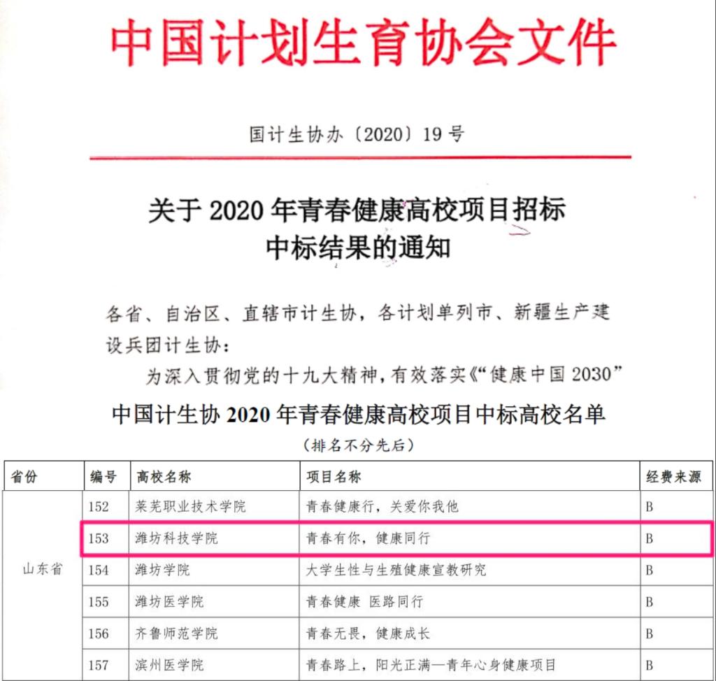 近日,中国计生协公布2020年青春健康高校项目立项名单,我校心理健康教育中心申报的“青春有你,健康同行”项目再次成功中标2020年度青春健康高校项目,创下连续三次中标该项目的佳绩。