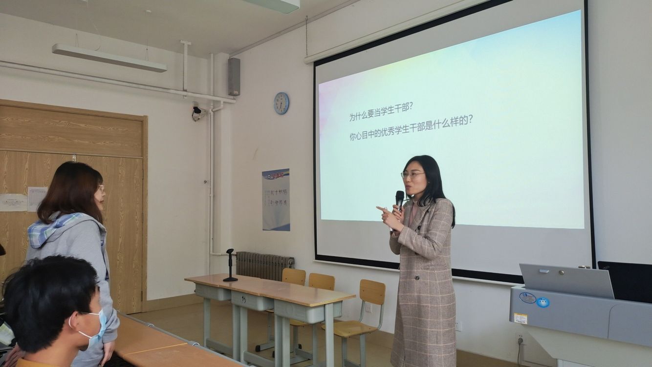张艳梅老师围绕“有位”、“有为”、“有威”、“有心”,讲述了学生干部的职责,学习和学生干部工作的关系,团队协作能力的提升,心理健康的调适四个方面内容。